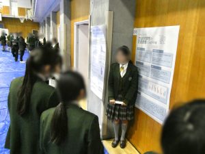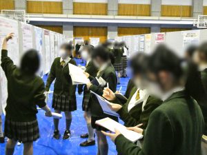 中学3年生、高校1年生たち、保護者、教員が聴講者として、講堂・ゼミ室でのプレゼンテーションを聴講し、体育館を巡ってポスターとしてまとめられた研究内容に質問を投げかけていきます。